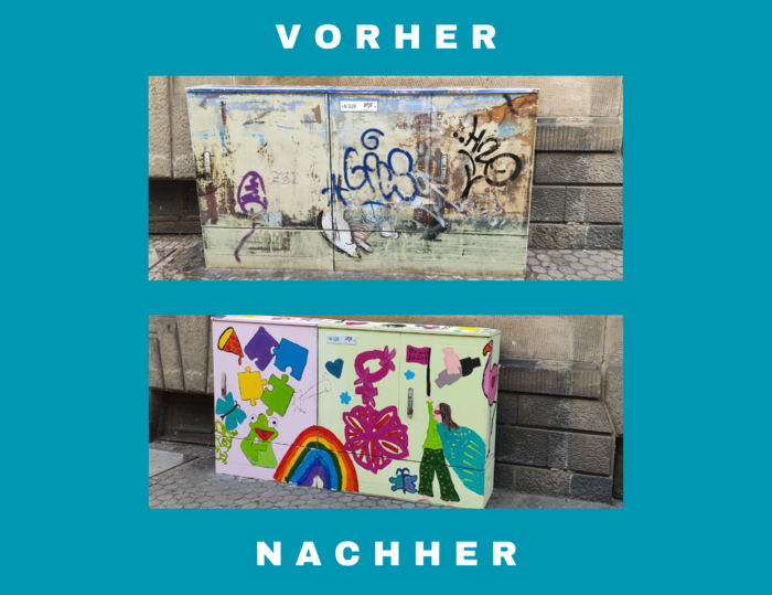 In den Sommerferien wurde der Stromkasten der MVV gegenüber vom Jugendtreff ikubiz QuiSt bemalt. Die Mädchen* aus dem Projekt Hey Girl! und die Jugendlichen des Treffs haben zusammen ein großartiges Ergebnis geschaffen, welches sie sich im Vorfeld selbst überlegt haben. Der Stromkasten erstrahlt nun ganz bunt mit Flamingos, Boxhandschuhen, Superwoman und Co.